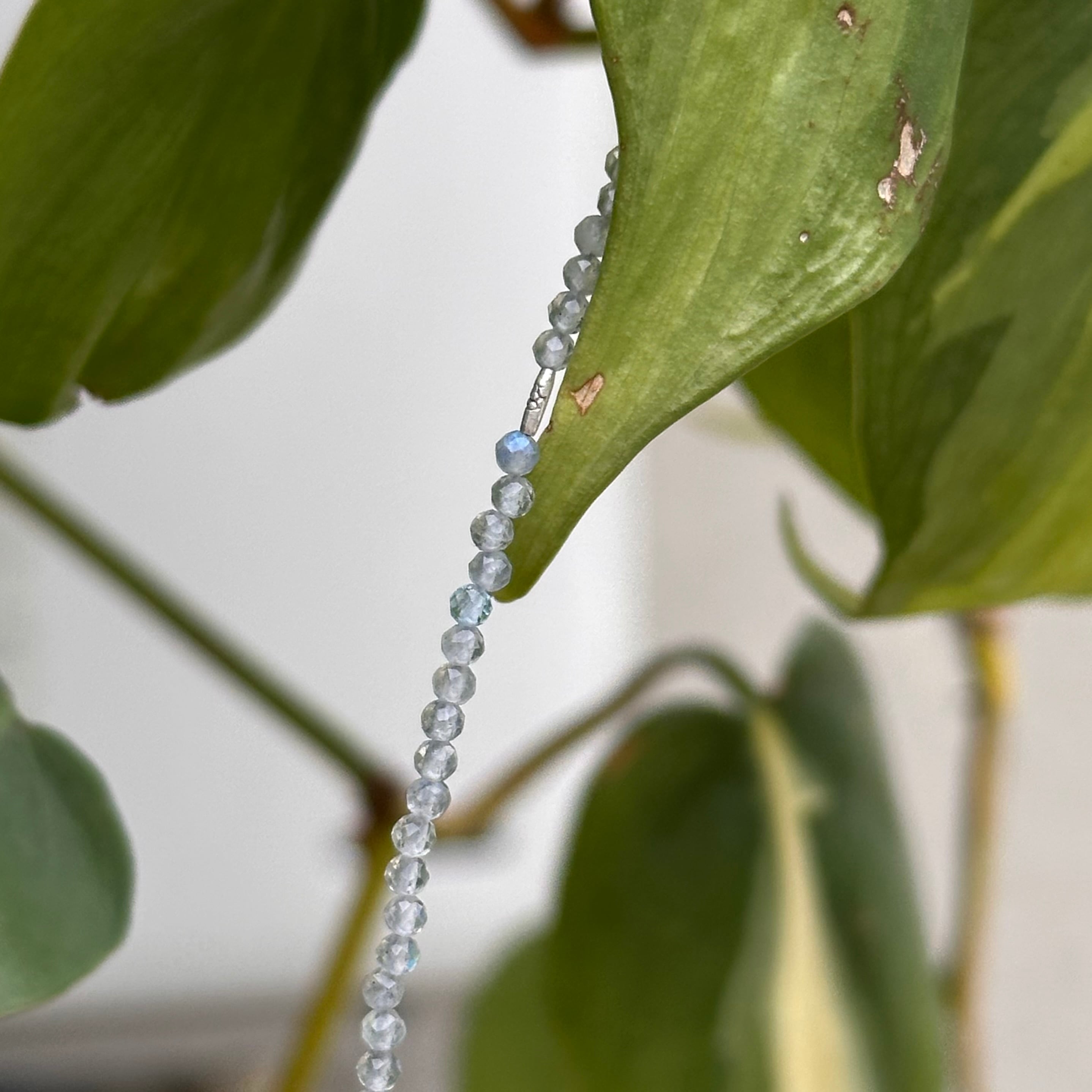 光の角度によってブルーのシラーがふわりと現れるラブラドライトを使用しています。