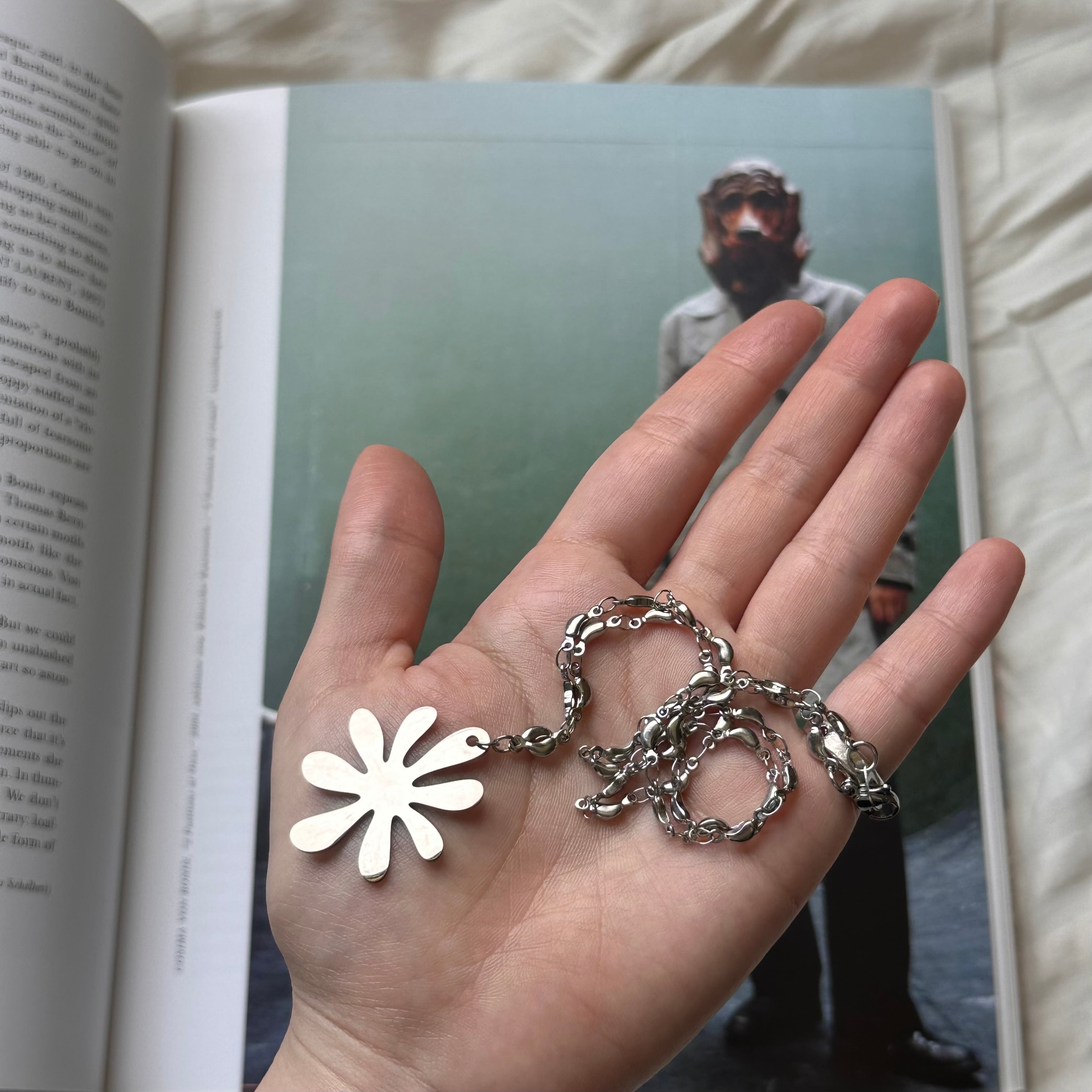 歪んだお花のモチーフと、月をかたどった個性的なチェーンが胸元で出会う、幻想的なネックレス。