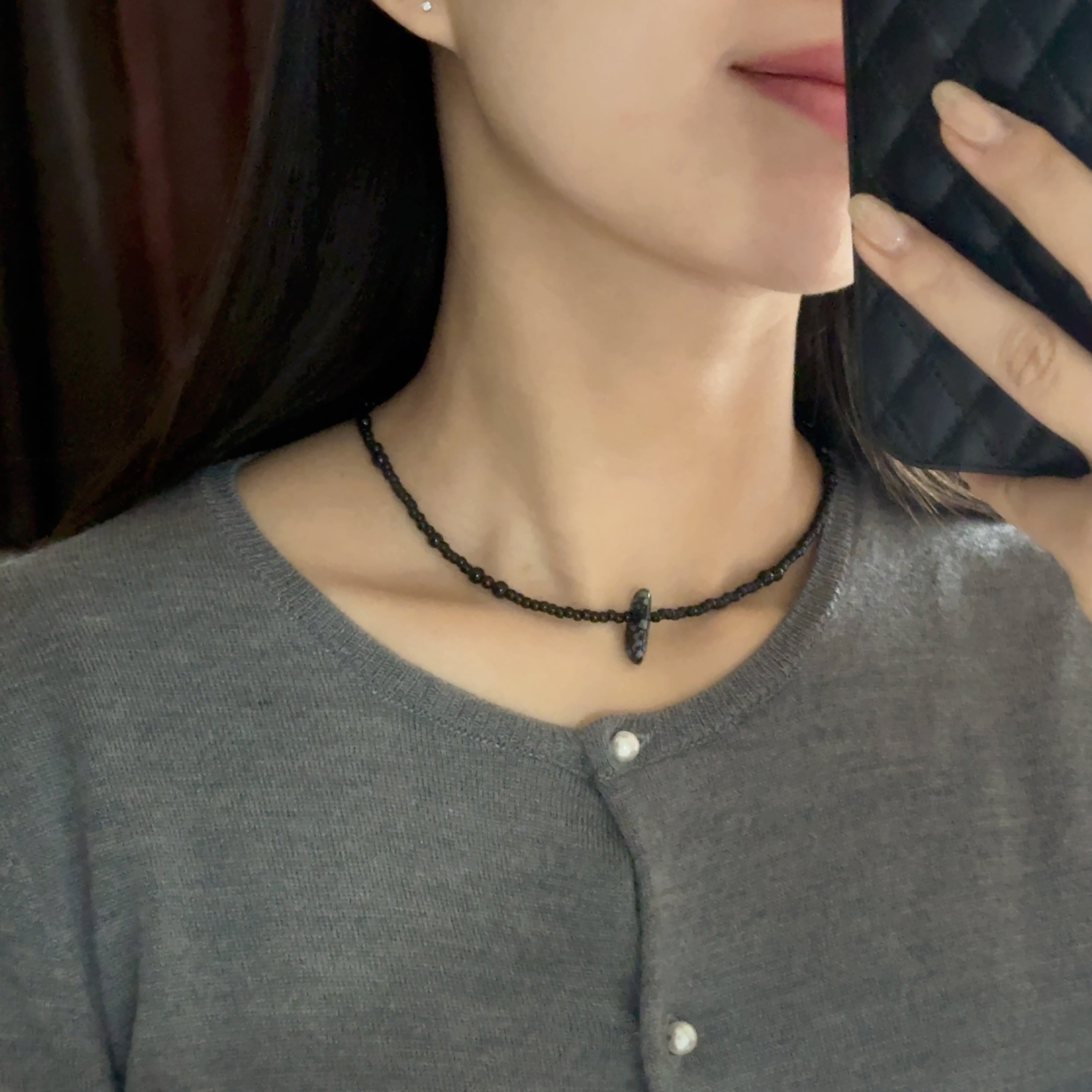 買い付けの際に一目惚れした、スノーフレークオブシディアンをメインに使用したネックレス。